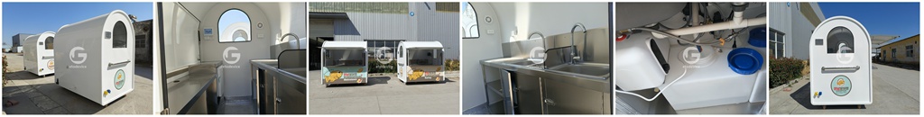 The kiosk includes custom stainless-steel workbenches, a built-in mini fridge, and a 2+1 water sink system with hot and cold taps. The clean and bright interior is made from fiberglass panels for easy cleaning and durability. Each window comes with a flip-down serving shelf, making it easy to serve customers from any direction.