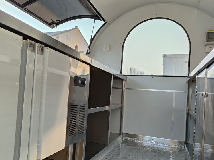 The food kiosk features specific spaces for working, storage, display, refrigeration, and cleaning. You can use it to prepare and sell almost any type of food and beverages. Additional appliances can also be accommodated.