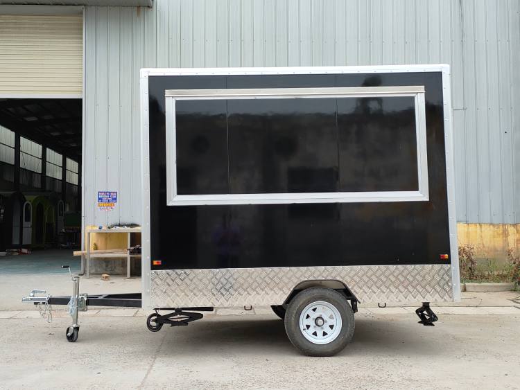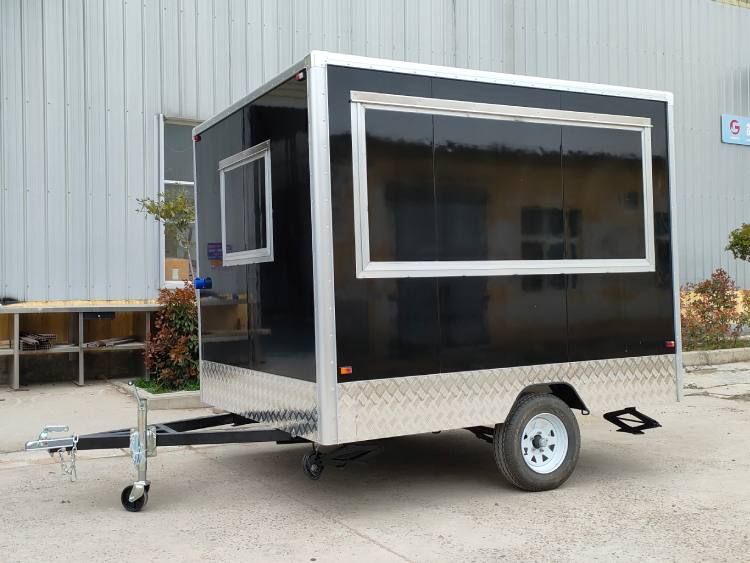 This 9ft black ice cream trailer is a custom project for a restaurant in the UK, serving as a mobile ice cream shop. It is UK-compliant, equipped with required hitching kits, trailer accessories, electrical fixtures, equipment, and water sink kits. You can tow it with any vehicle to any location, and everything can be set up within minutes.