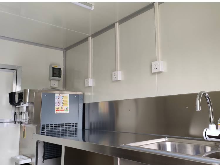The ice cream trailer is equipped with a commercial-grade soft-serve machine, allowing you to make your own fresh ice cream inside the trailer. Additionally, you can use your own professional equipment. Dedicated circuits are designed to protect your appliances from electrical damage. Sinks, a faucet, a water pump, and 25L water tanks are included.