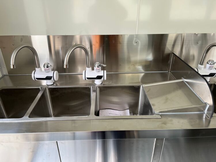 Water System: 3 compartment water sink with splash guards / hand sink / cold and hot water faucets / 25L plastic water tanks / floor drain